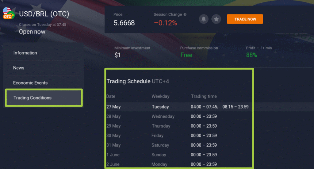 Um die genauen Handelszeiten für einen bestimmten OTC-Vermögenswert zu erfahren, klicken Sie einfach auf das Symbol „Info“ neben dem Namen und gehen dann zum Abschnitt „Handelsbedingungen“.