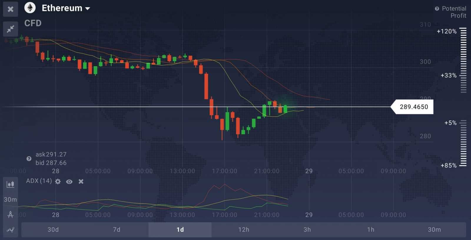 Unlike its elder counterpart, Ethereum was not as good at recovering after an abrupt plunge. The cryptocurrency depreciated from $303 to $282. It later retracted to $290 but a slight negative movement can still be observed. The short-term ETH trend is negative as displayed by the Alligator and ADX. Most major cryptocurrencies demonstrated limited downward movement for a short period of time. Out of top-ten cryptocurrencies by market capitalization, only IOTA has demonstrated single digit growth over the course of 24 hours. The rest do remain in the red.
