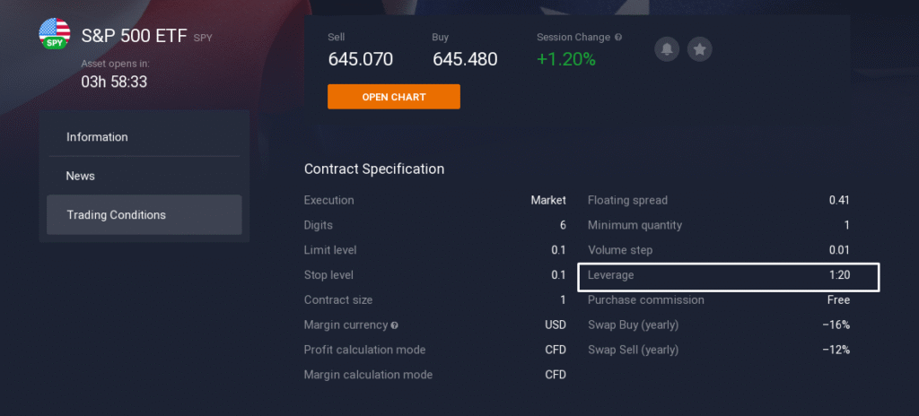 To see the available leverage for the chosen asset, open the asset’s Info panel and tap Trading conditions.