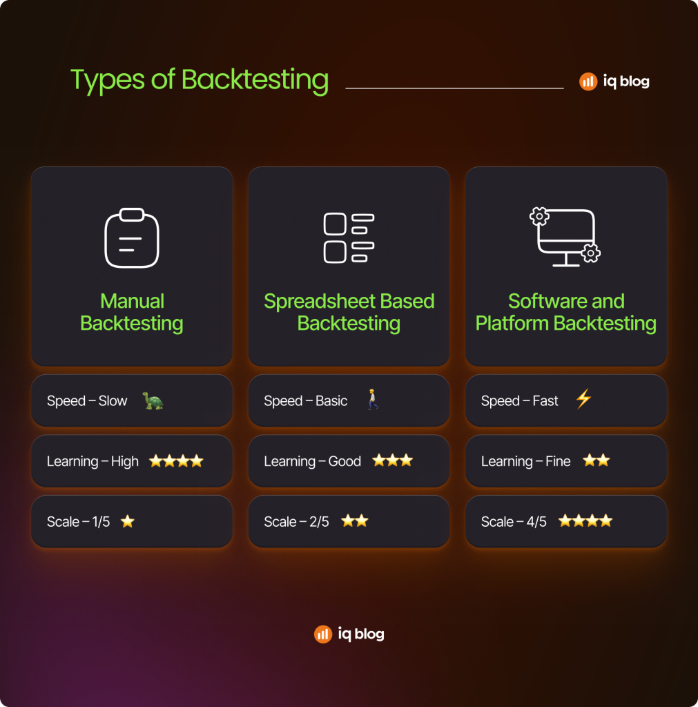 Manual backtesting is the most basic and educational approach. Traders scroll through historical charts and apply their strategy rules candle by candle. Each entry, exit and stop level is recorded manually, which forces strict rule awareness and discipline.
