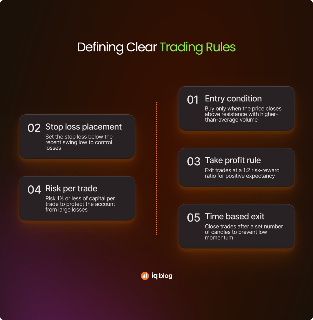 - Execute trades consistently – Apply the rules exactly as written, without hindsight or discretionary adjustments. Every trade must be treated the same way.