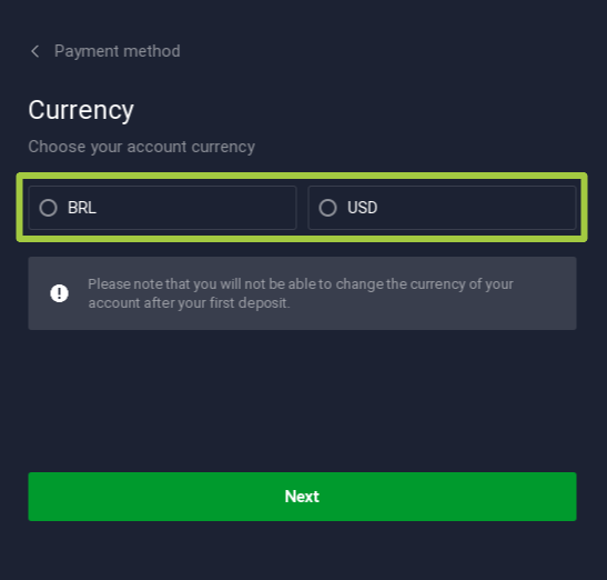 If this is your first-time deposit, choose the payment currency. Note that it will be saved for all subsequent payments and can’t be changed later.