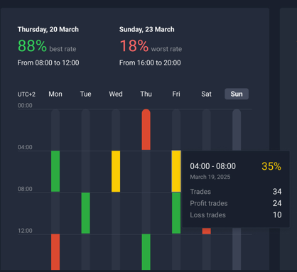 For example, a trader consistently sees their best results on Thursdays between 08:00 and 12:00, with a win rate over 80%. But on Sundays from 16:00 to 20:00, their success rate drops below 20%. That’s a big gap — and definitely something worth noticing.
