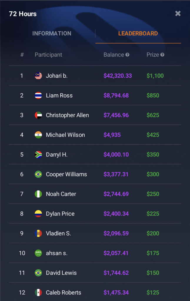 5. Once the tournament starts, you’ll receive a special trading balance to place deals and compete for prizes.