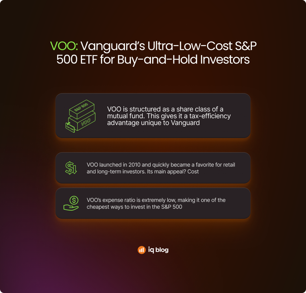 | VOO | Passive investors, DCA users, cost-focused portfolios | Ultra-low costs, simplicity, Vanguard ecosystem | Mutual Fund Share Class |
