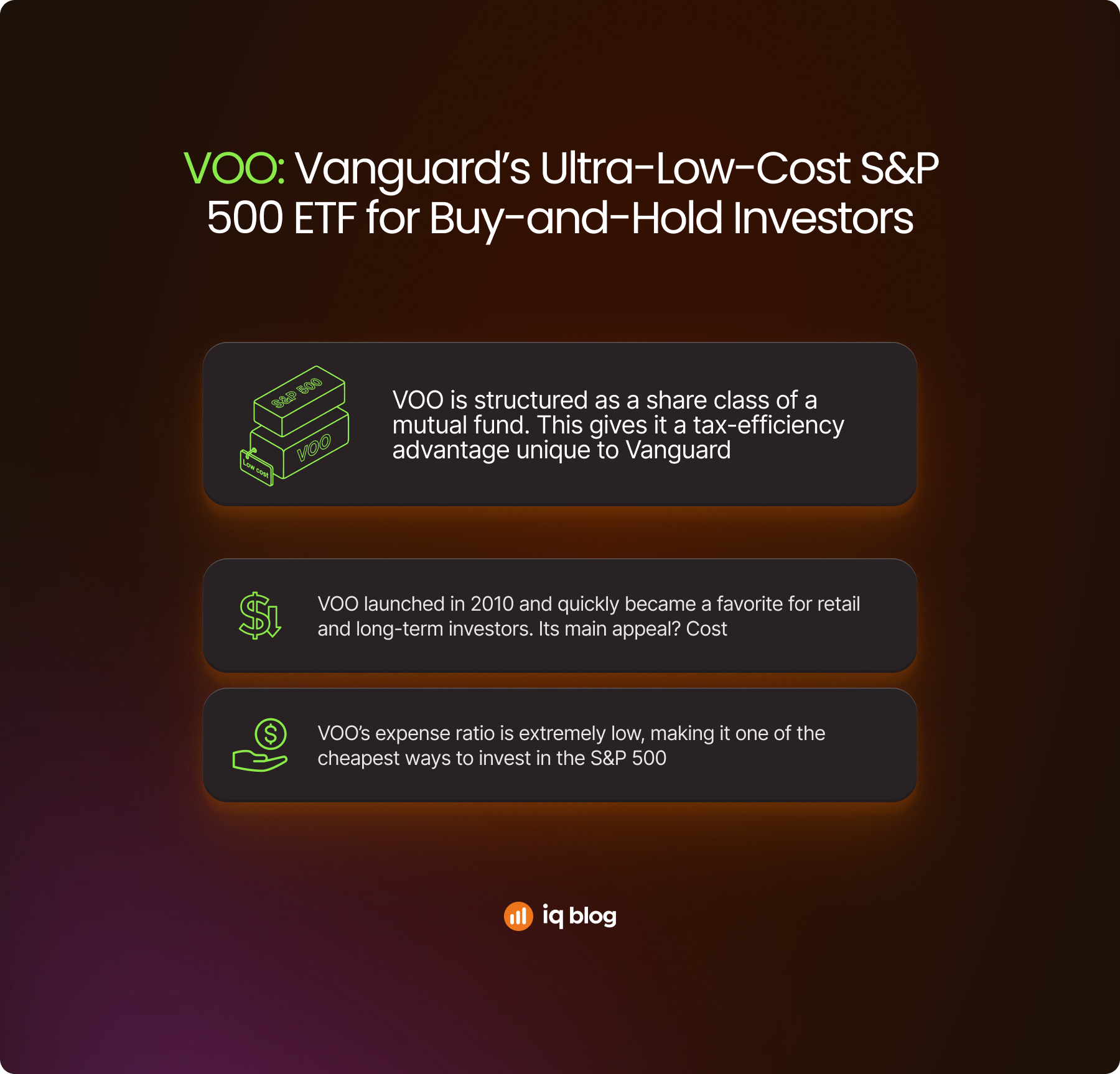 | SPY is built for speed and precision. | IVV is built for compounding and efficiency. | VOO is built for simplicity and long-term growth. |