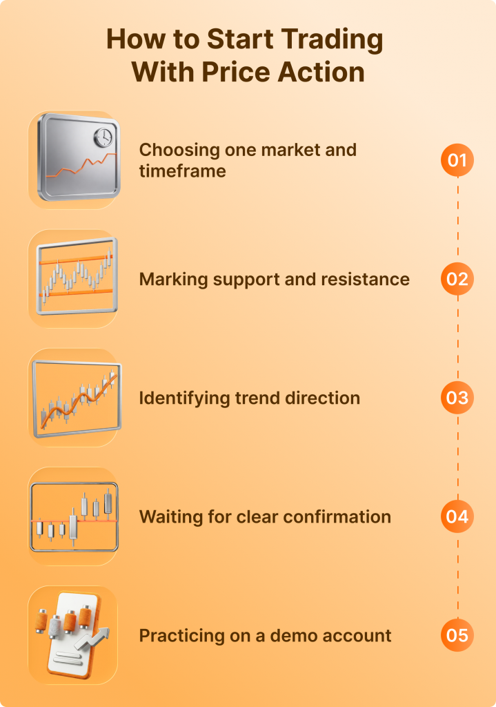 Starting with price action does not require complex tools. A clean chart is enough. The focus should be on observation and practice.