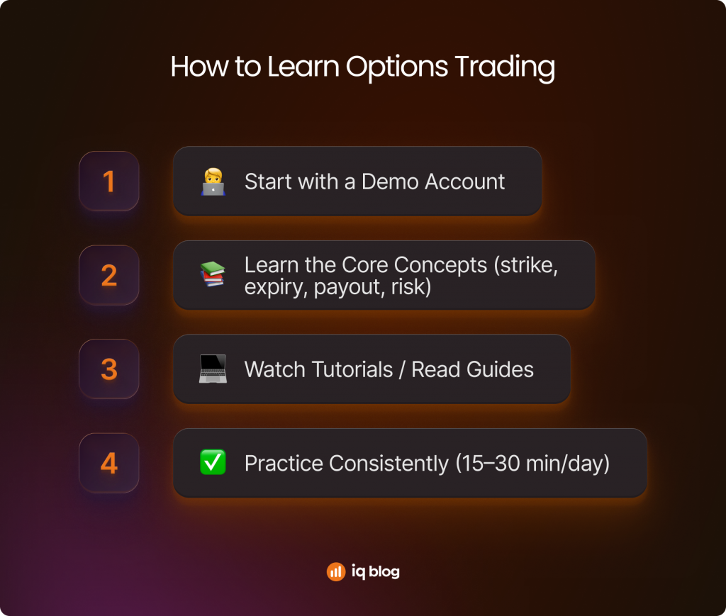 ✅ Study core concepts: strike price, expiration time, risk/reward, payout percentage.