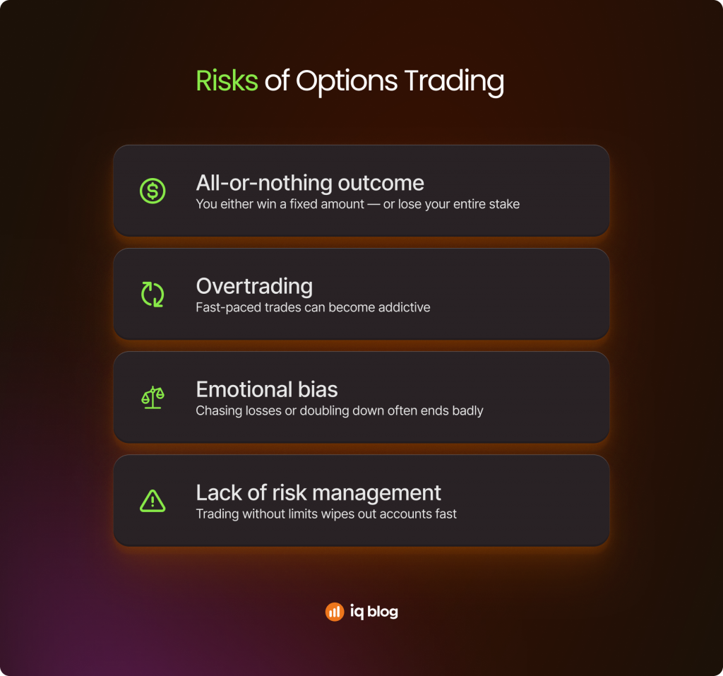 Options trading allows you to speculate on the direction of an asset’s price — without owning the asset itself. You’re not buying the asset — you’re betting on its direction. If you’re right, you win a fixed payout. If you’re wrong, you lose the amount you risked. That’s why options trading is fast, flexible — and risky.