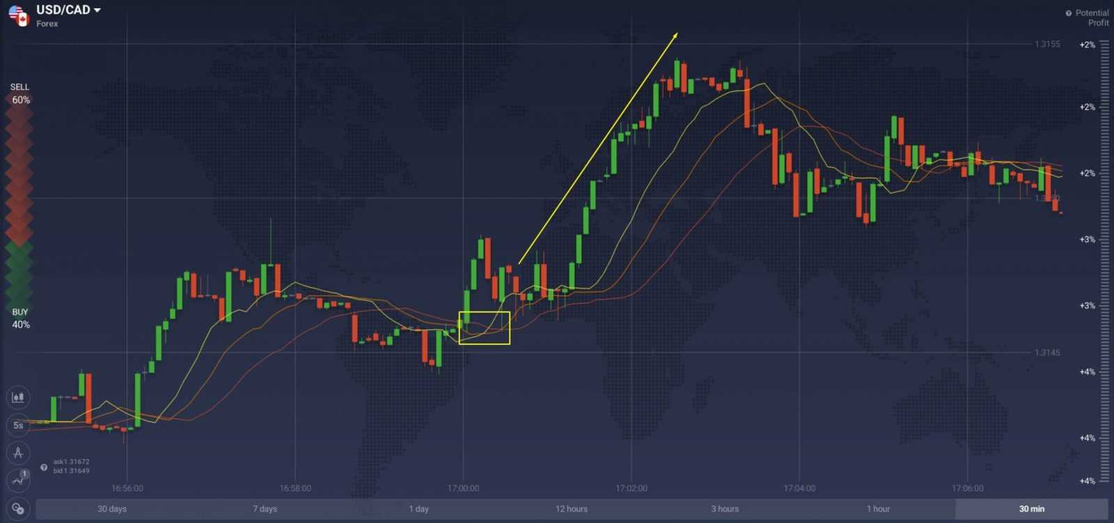 There are several ways to put the Alligator into action. As you probably already know, it can help you determine the strength of the prevailing trend. In trading, not only the direction of the trend matters. Its strength can be just as important, especially on shorter time intervals. When the distance between the jaw, the teeth and the lips of the Alligator increases, the trend is becoming stronger. And vice versa. When the lines come in touch with each other, the trend is most certainly dying out.