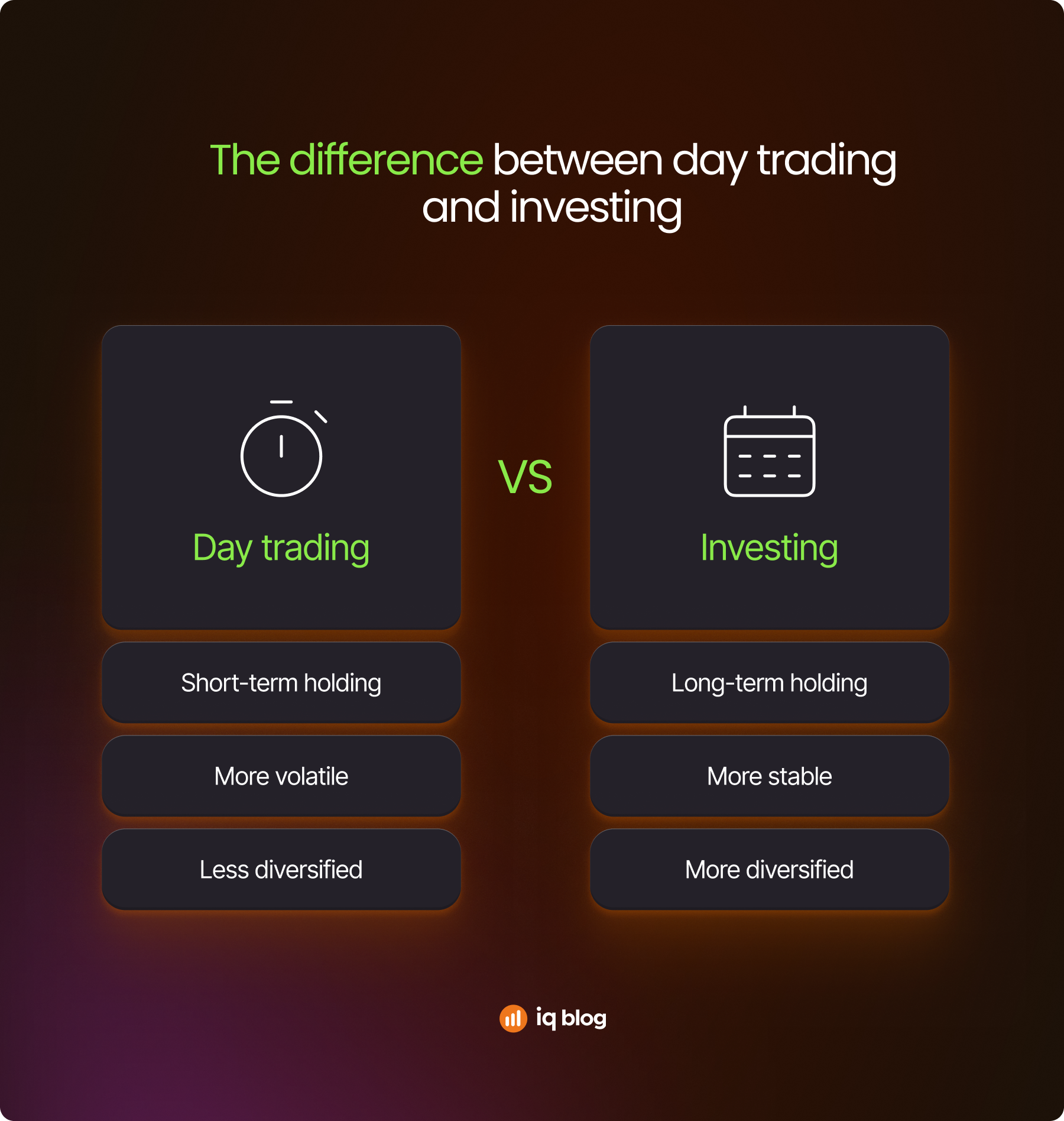 Day trading focuses on short-term price movements and closing trades within the same day. Investing is long-term and based on fundamentals, which aims to build value over months or years.