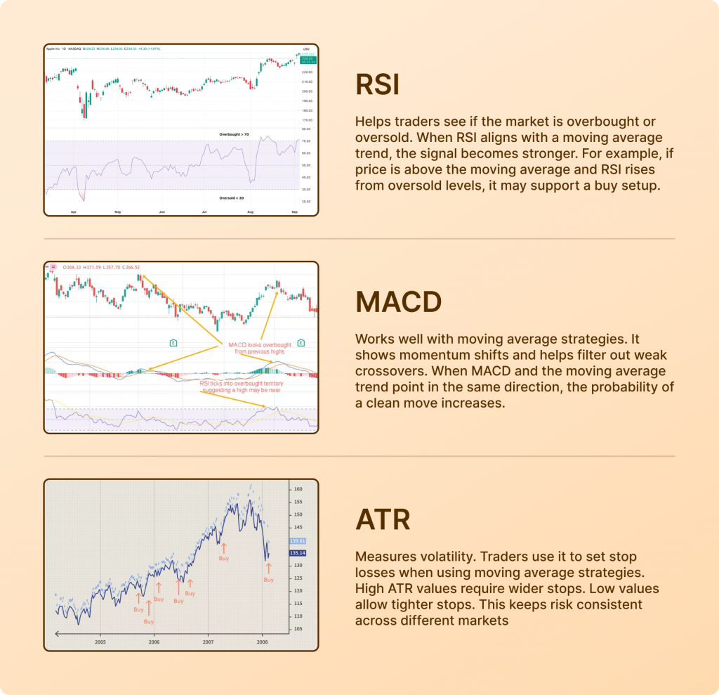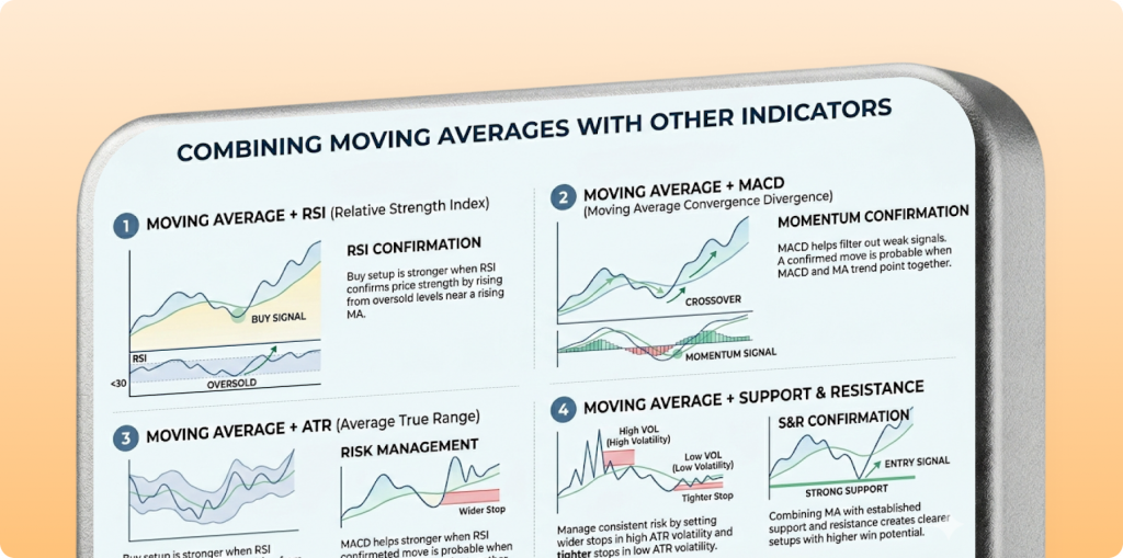 Moving averages work well on their own, but they become stronger when combined with other tools. Adding confirmation reduces false signals and improves timing.
