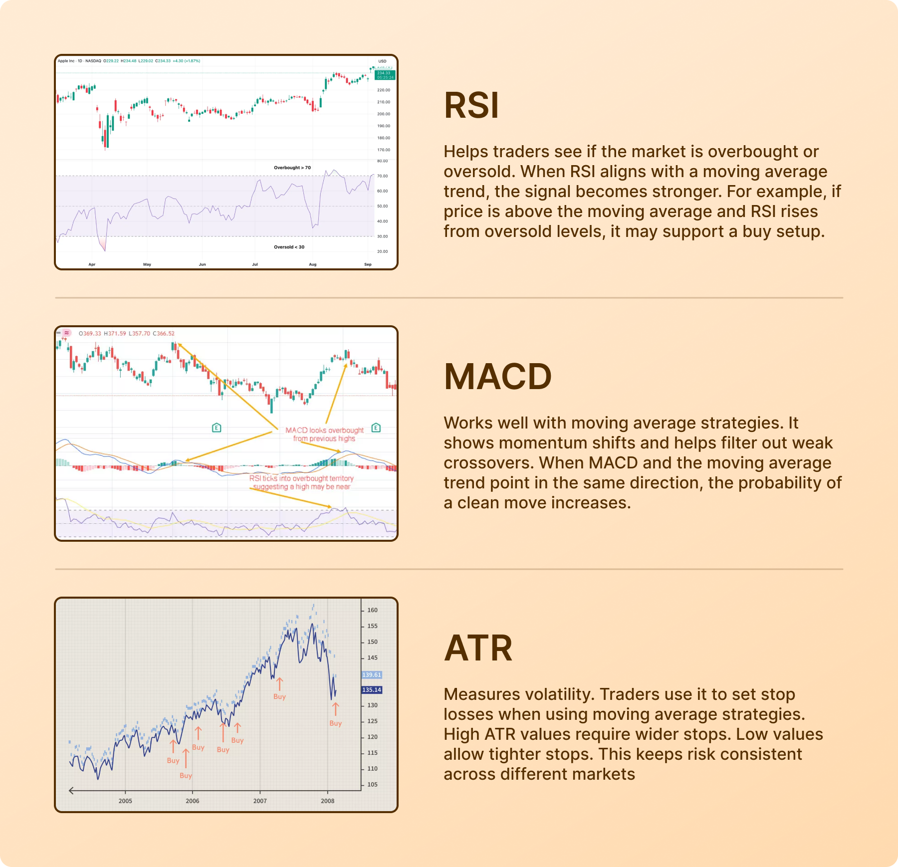 ATR measures volatility. Traders use it to set stop losses when using moving average strategies. High ATR values require wider stops. Low values allow tighter stops. This keeps risk consistent across different markets.