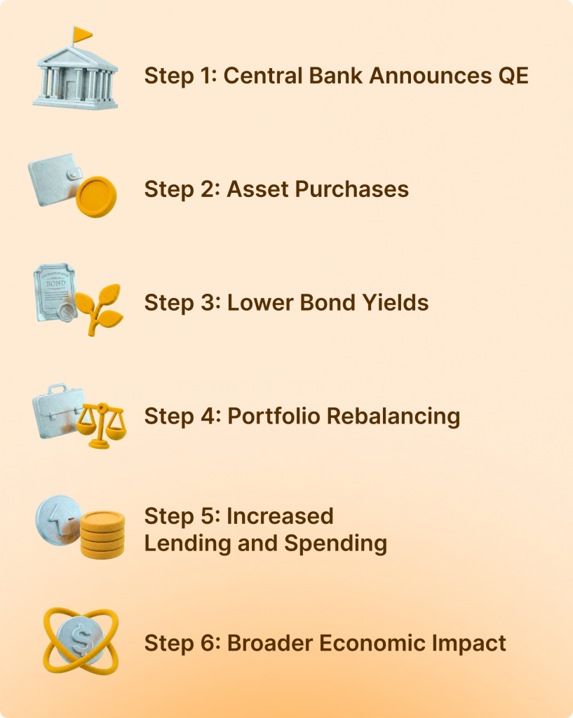 Quantitative easing follows a structured process that begins with a central bank decision and flows through to the wider economy. Each stage has specific effects that build on one another.