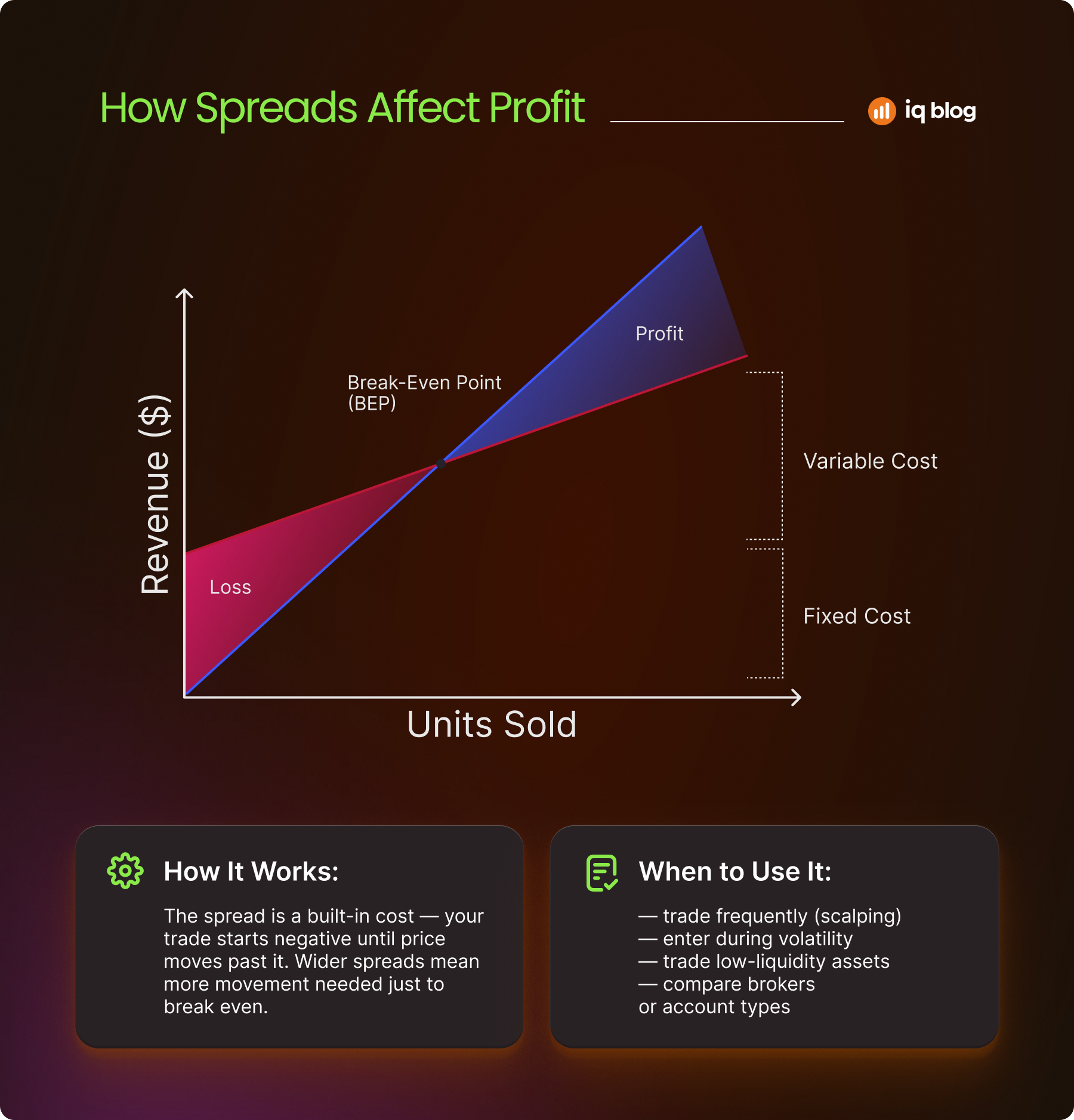 Trading spreads act like a built-in fee. The wider it is, the more price movement you need just to break even. For example, if we’re talking 5 pips, the market has to move 5 pips in your favor before you start seeing any profit.
