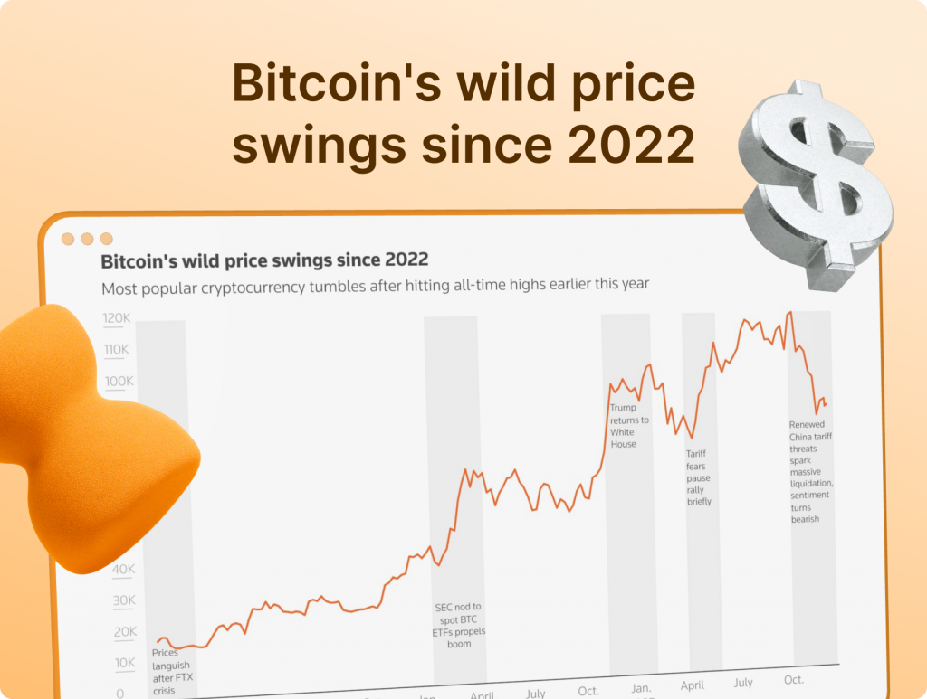 - -50% on late-2025 to early-2026 downturn — After a record high above ~$125,000 in late 2025, it fell toward ~$60,000.