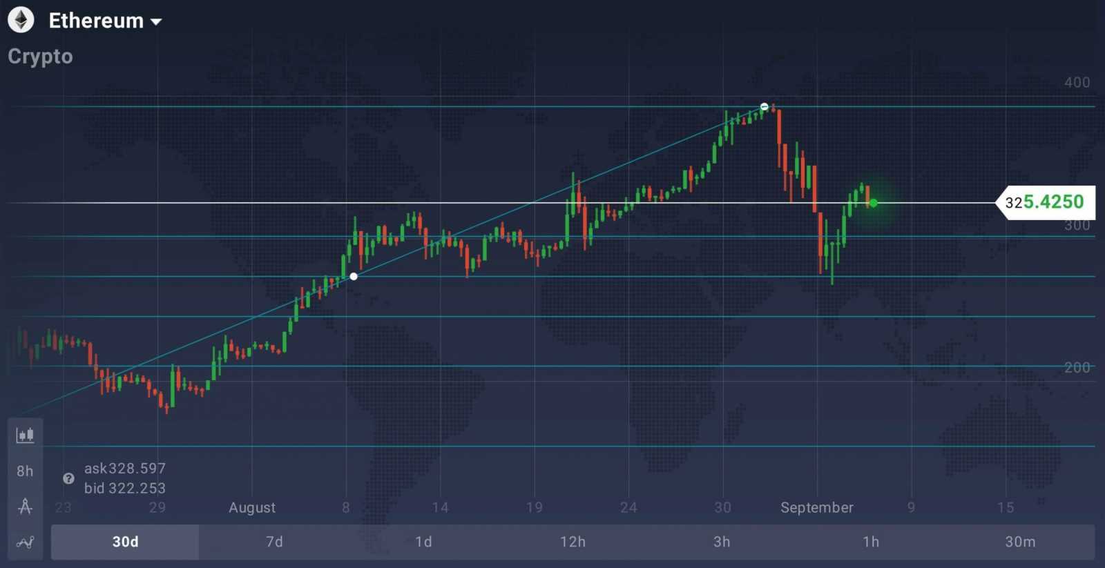 El Ethereum, actualmente la segunda mayor moneda mundial, con una capitalización de mercado de más de 30$ mil millones, se ha visto severamente perjudicada por la reciente caída del mercado, desencadenada por la introducción de regulaciones desfavorables por parte de China con respecto a las ICOs. En los meses precedentes a la caída la moneda ha mostrado una actuación sorprendente. Comercializandose alrededor de los 11$ el 2 de febrero, Ethereum había alcanzado los 387$ unas horas antes del crac. Desde entonces se ha retraído hasta los 155$ pero rápidamente rebotó hasta los 392$, alcanzando una vez más un máximo histórico. El precio de acción del ETH está de nuevo en la brecha.