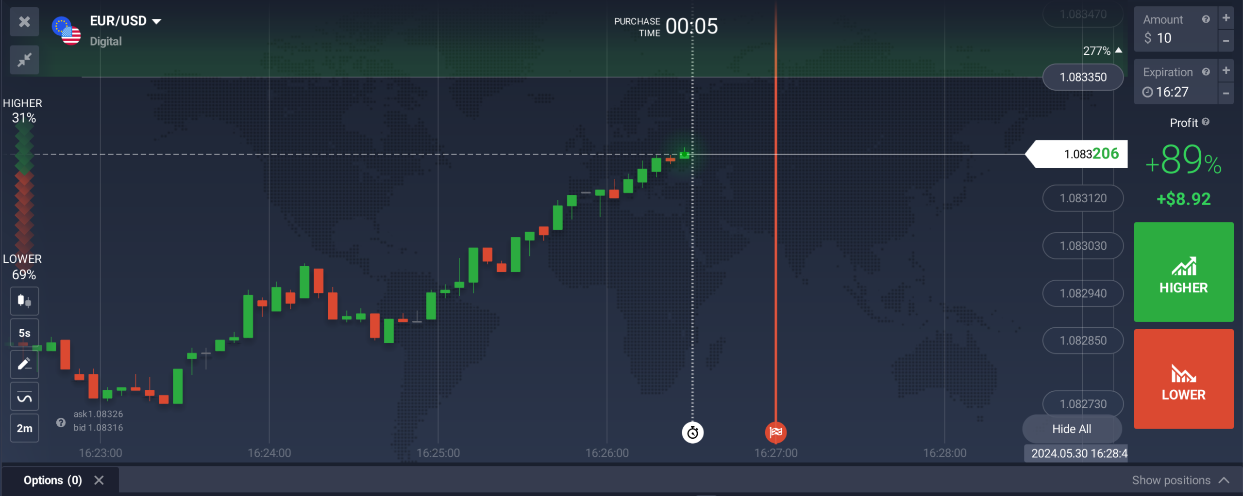 La idea principal de las opciones binarias es beneficiarse de hacer la predicción correcta sobre la dirección del precio. Puedes abrir una operación haciendo clic en «Más alto» si crees que el precio seguirá subiendo, o en «Más bajo» si crees que podría bajar. El beneficio se recibe si la predicción es correcta en el momento del vencimiento. Para convertirte en un profesional de las opciones binarias, lee la guía completa sobre trading de opciones binarias.