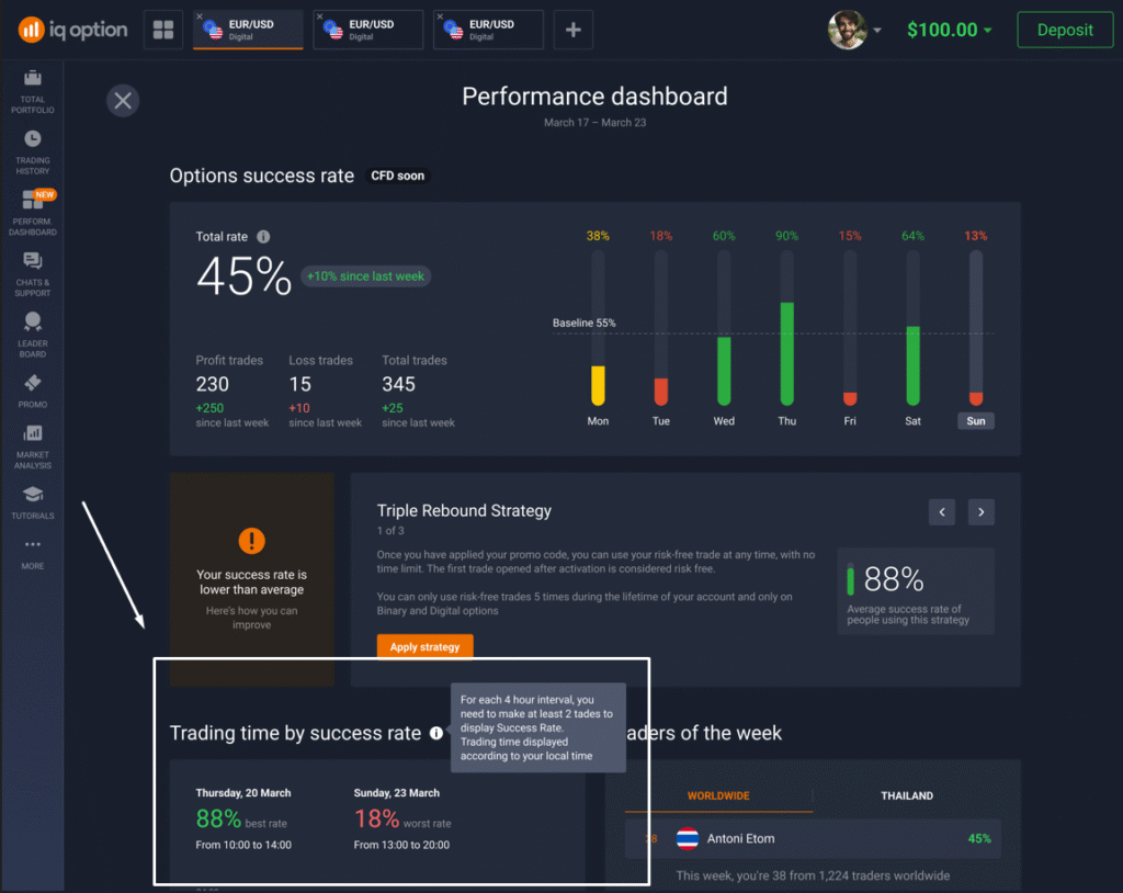 ¿Alguna vez has sentido que operas mejor a determinadas horas del día? IQ Option lo registra por ti —y te lo muestra en tu panel de rendimiento con una herramienta llamada Tiempo de Trading por Tasa de Éxito. Es como tener una vista ampliada de tus patrones de trading.