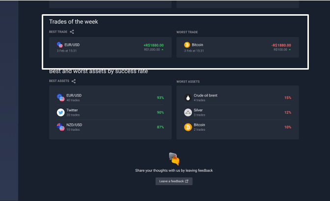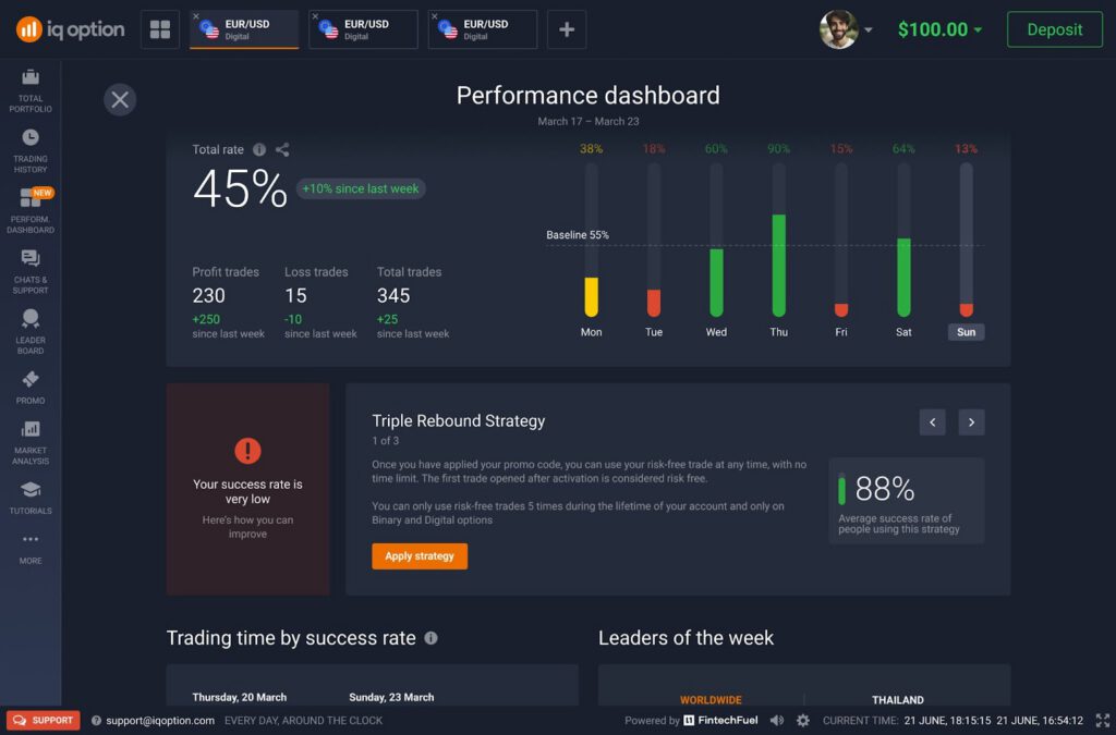 El Panel de Rendimiento es una función integrada en la plataforma IQ Option que ofrece una visión general de tu actividad de trading, tu índice de éxito y las tendencias del rendimiento del mercado. Funciona tanto en la cuenta demo como en la cuenta real, lo que motiva a los traders a mantenerse activos y mejorar su comportamiento en el trading con comentarios útiles.