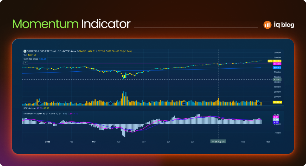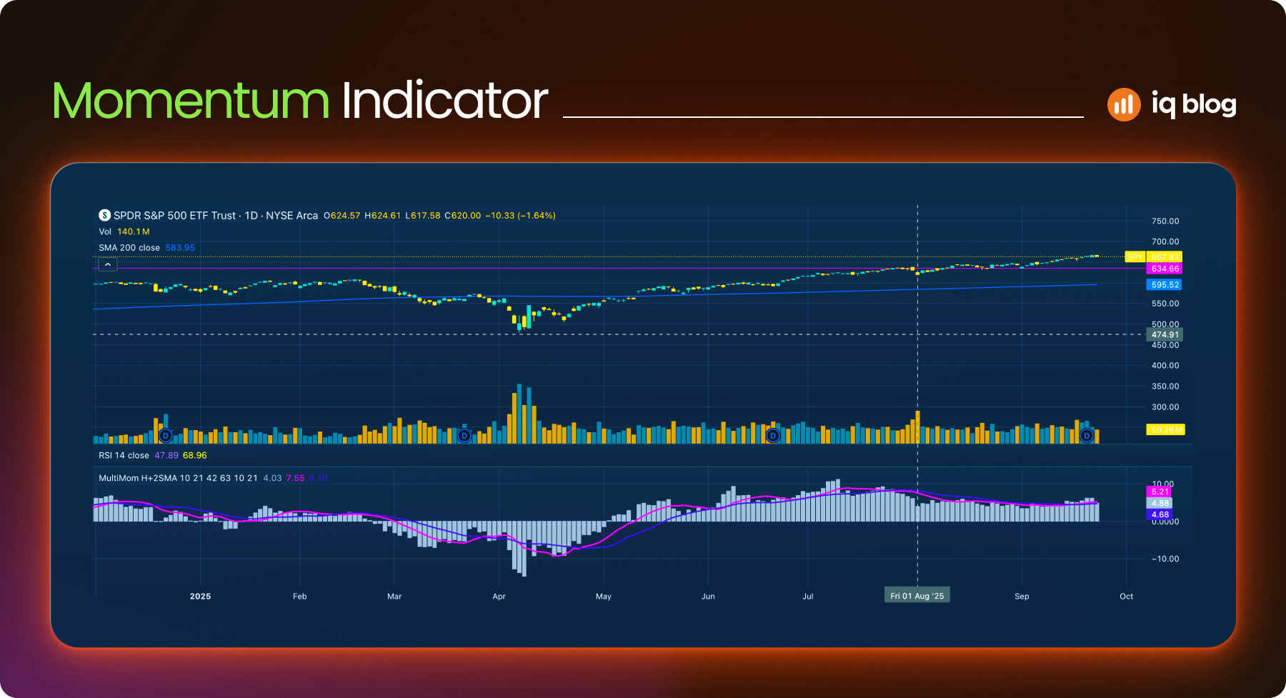 En términos prácticos, las configuraciones de momentum se identifican usando indicadores técnicos y análisis de volumen. Las medias móviles confirman la tendencia general, mientras que los indicadores como RSI, MACD y los osciladores estocásticos ayudan a determinar si el momentum tiene la fuerza suficiente o si se prolonga demasiado. El volumen es crucial, ya que los movimientos fuertes normalmente se producen cuando la actividad de trading es al menos el doble del promedio diario.