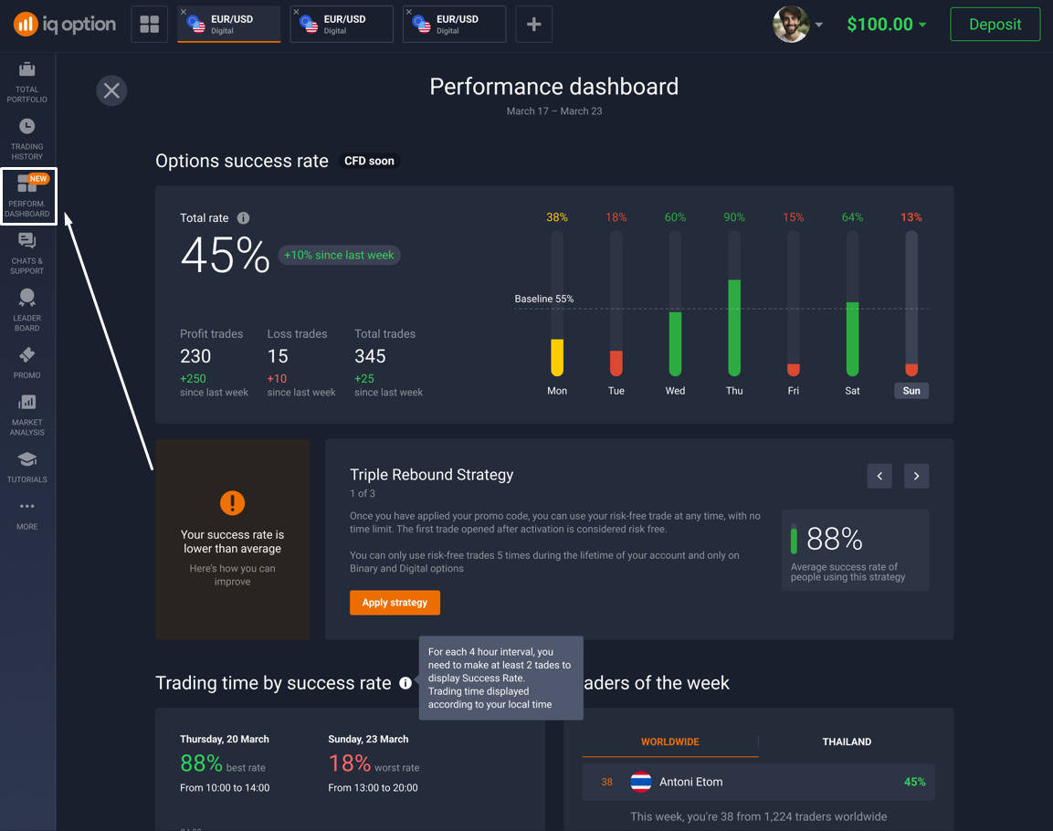 Avez-vous déjà eu l’impression de mieux trader à certains moments de la journée ? IQ Option suit cela pour vous et l’affiche dans votre tableau de bord des performances à l’aide d’un outil appelé « Temps de trading par taux de réussite ». C’est comme avoir une vue agrandie de vos modèles de trading.