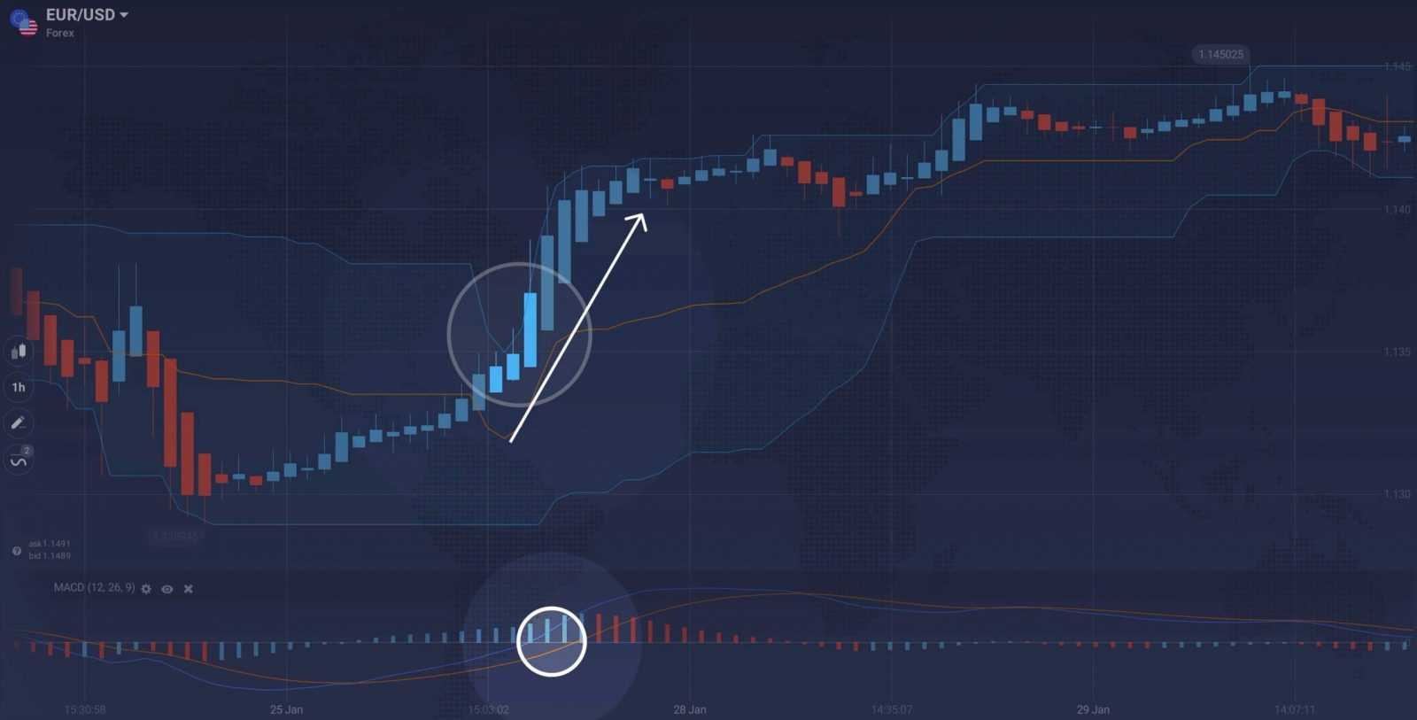 Em segundo lugar, o Canais de Donchian pode ser usado em combinação com o MACD. Aqui, o Canais de Donchian funcionará como descrito acima. O MACD, como você provavelmente já sabe, pode enviar sinais de compra e venda por conta própria. Quando a linha MACD rápida cruza a linha MACD lenta vinda de cima, uma tendência ascendente pode ser esperada. Quando o oposto é verdadeiro, pode-se esperar uma tendência de queda. Em outras palavras, o MACD é usado como uma confirmação para sinais do Canais de Donchian.
