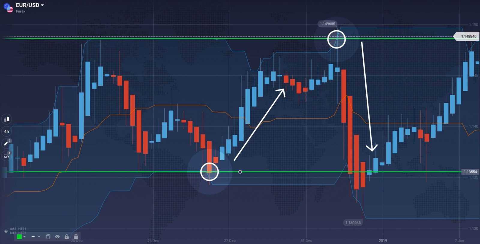 Primeiro, a combinação das linhas superior e inferior pode ser tratada como níveis dinâmicos de suporte/resistência. Neste caso, os traders esperariam que o preço do ativo saltasse da linha superior durante uma tendência de alta e da linha inferior durante uma tendência de baixa. Note que durante uma tendência forte, não importa se positiva ou negativa, as velas fecharão consecutivamente em níveis mais altos/mais baixos, empurrando a linha para a direção da tendência predominante. Ao usar essa estratégia, os traders podem abrir uma posição de “COMPRA” quando o preço do ativo estiver acima da linha do meio e uma posição de “VENDA”, quando o preço estiver abaixo da linha do meio. Considere receber uma confirmação para o sinal que este indicador está enviando antes de abrir uma oferta.