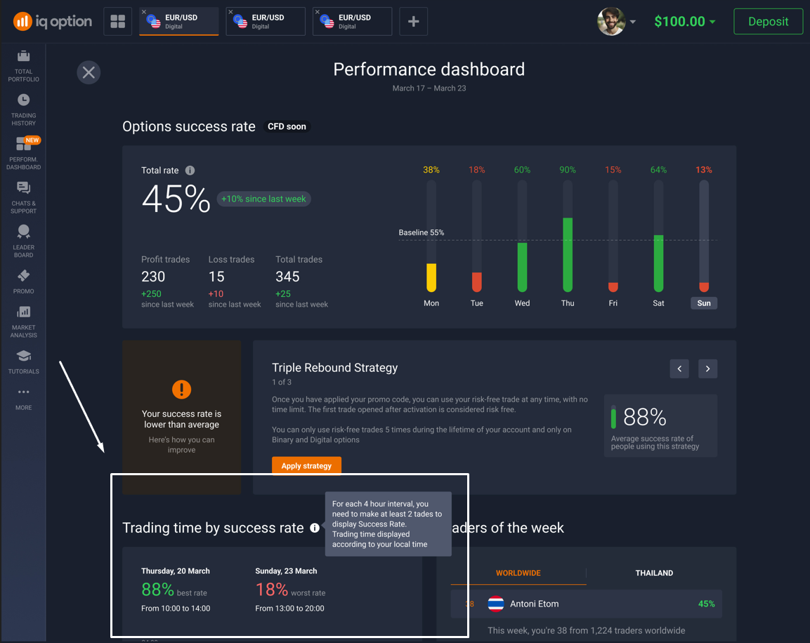 Você já sentiu que negocia melhor em certos momentos do dia? A IQ Option realmente faz esse rastreamento para você e mostra isso no seu Painel de Desempenho com uma ferramenta chamada Horário de negociação por taxa de sucesso. É como ter uma visão ampliada dos seus padrões de negociação.