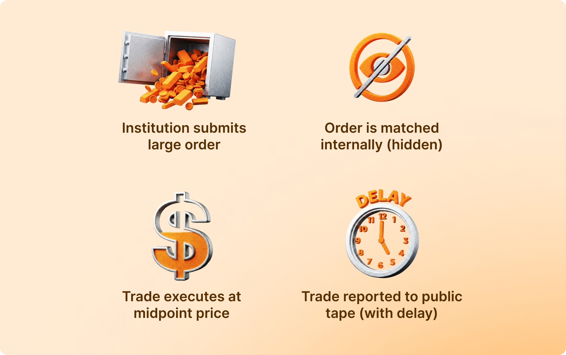 ● Impacto no preço: as ordens públicas podem fazer com que os preços subam ou desçam se o mercado registrar uma grande demanda ou oferta. As Dark Pools escondem essa pressão até depois da negociação.