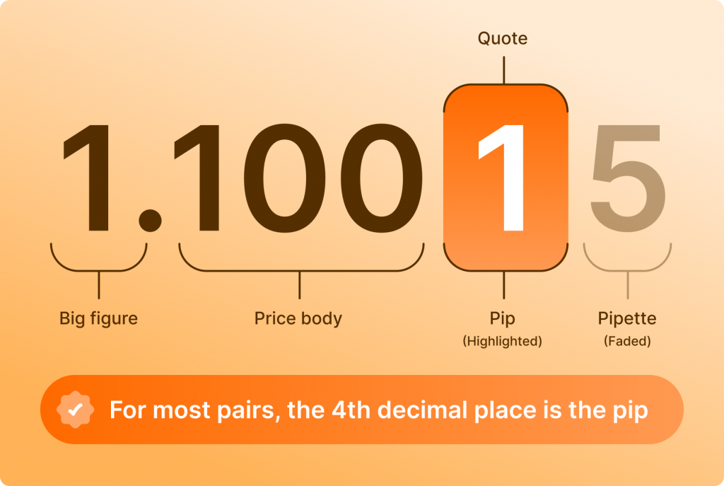 สำหรับคู่สกุลเงินหลักส่วนใหญ่ เช่น EUR/USD, GBP/USD หรือ AUD/USD ค่า Pip จะแสดงในรูปทศนิยมตำแหน่งที่ 4 ($0.0001$)