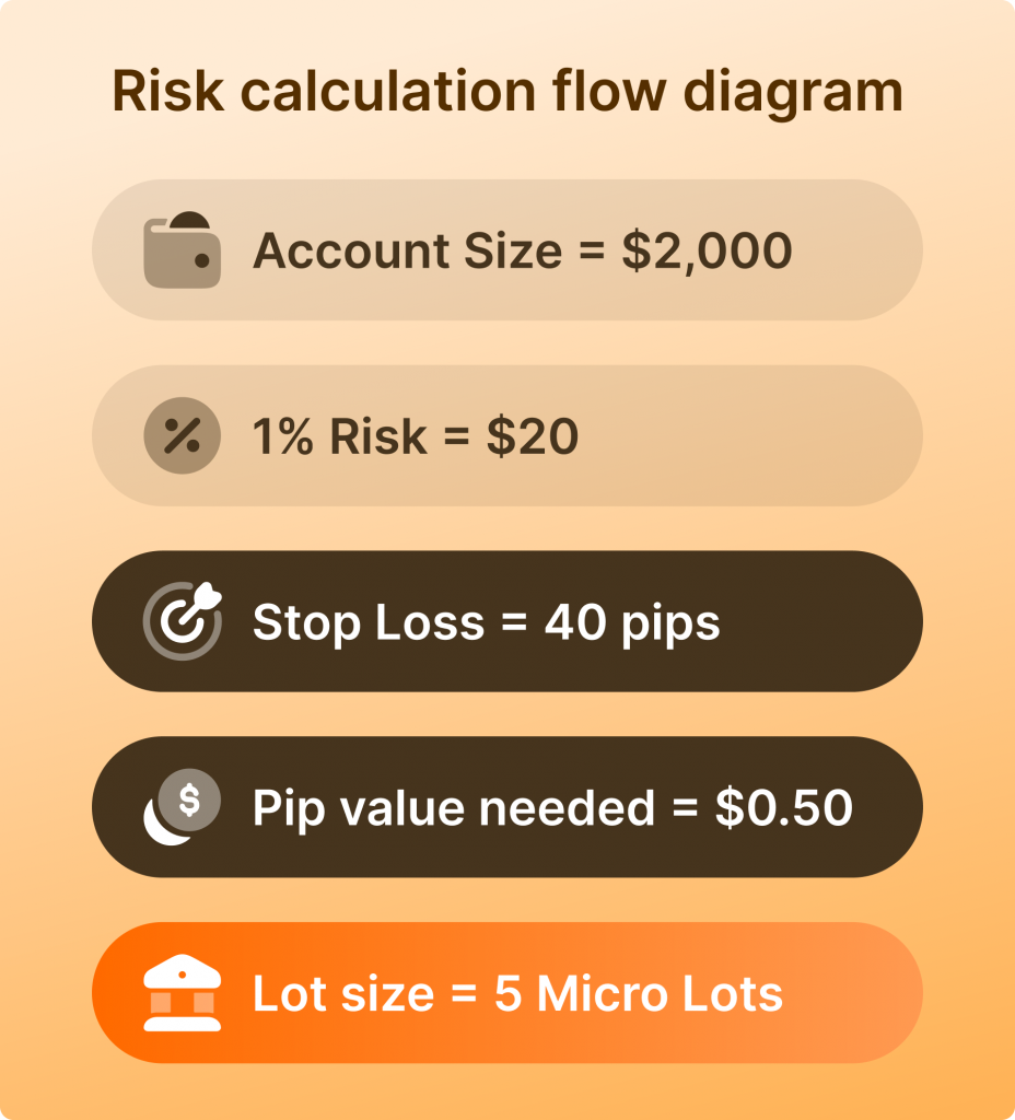 หากยอมขาดทุนได้เพียง $20 และระยะขาดทุนอยู่ที่ 40 Pip ต้องเทรดในขนาดที่ทำให้ค่า Pip เท่ากับ $0.50 ($20 / 40$) นั่นแปลว่าต้องใช้ขนาดของล็อตที่ 5 ไมโครล็อต