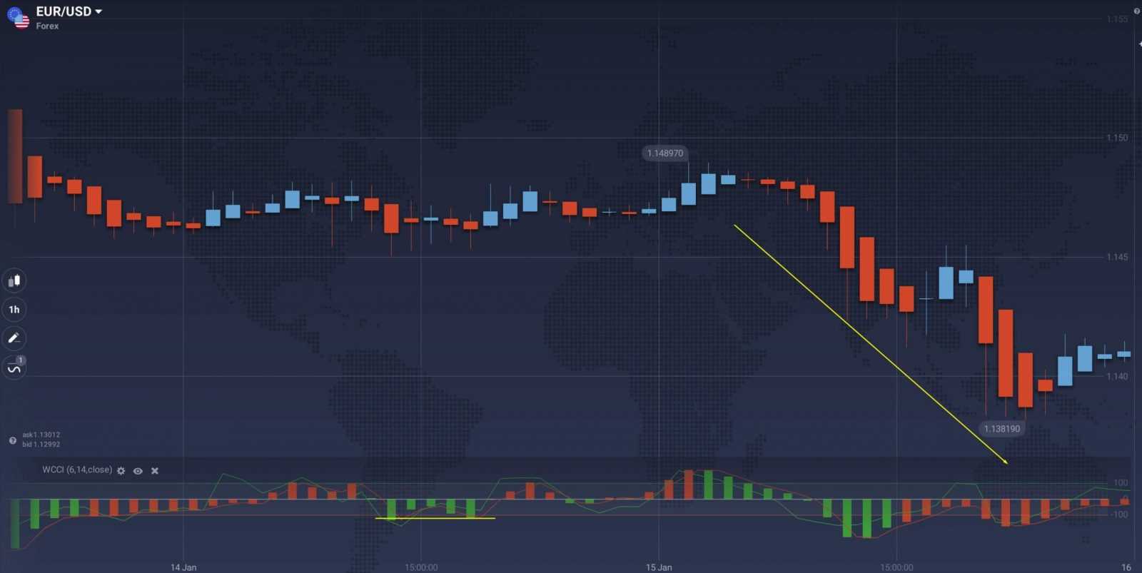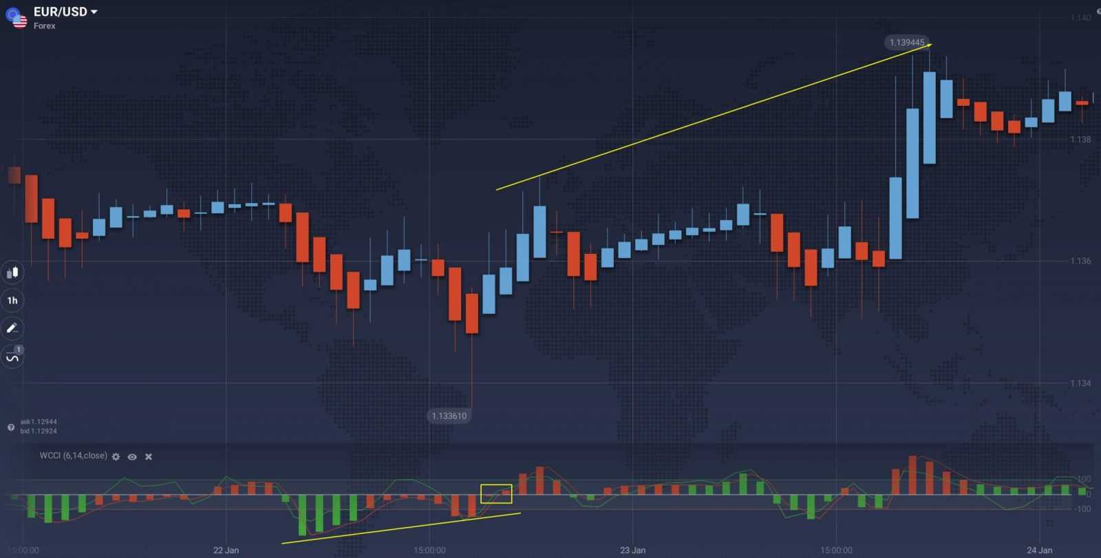 เมื่อมีจุดยอดและผ่าน CCI ที่สามารถเชื่อมต่อได้ด้วยเส้นตรง และเส้นตรงกำลังชี้ไปที่ศูนย์ แนวโน้มที่แข็งแรงในทิศทางของเส้นตรงสามารถเกิดขึ้นได้